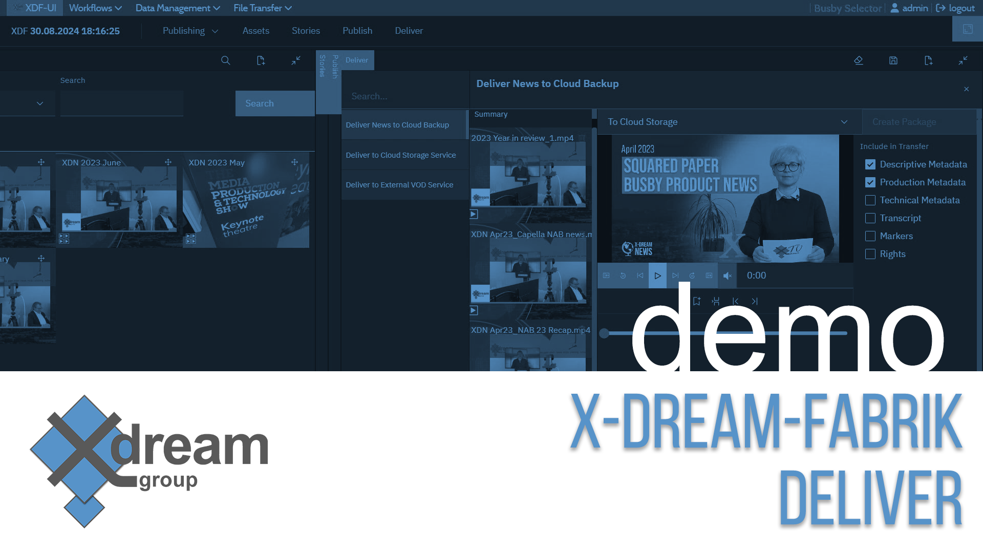 x-dream-Fabrik is a pre-integrated, pre-configured and managed end-to-end solution for the media industry. Thanks to its unique UI and microservices architecture it covers the complete business process from content production to post-production, asset management, story creation to playout, publishing, sales and distribution. x-dream-Fabrik is a ready-to-go platform with a clear licensing model. It runs on-premises, in public or private clouds or hybrid.