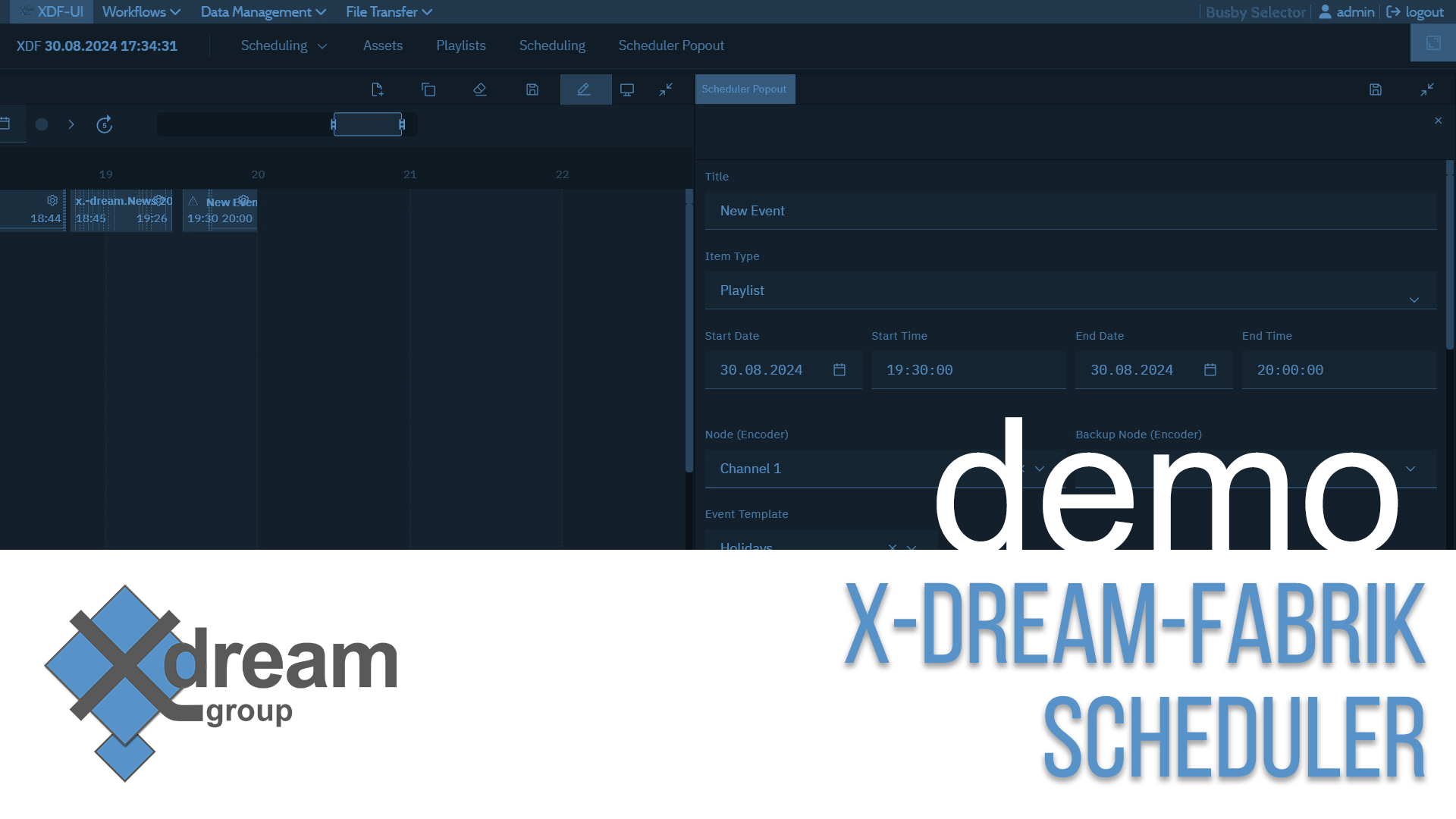 PLAYOUT consists from the x-dream-Fabrik modules Upload, Archive, Schedule, Playout and Monitor. It can be combined with all source modules like Record, Ingest, File Exchange, with the post-production product PRODUCE, with the media management product ARCHIVE, and with the output products like PUBLISH and DELIVER.